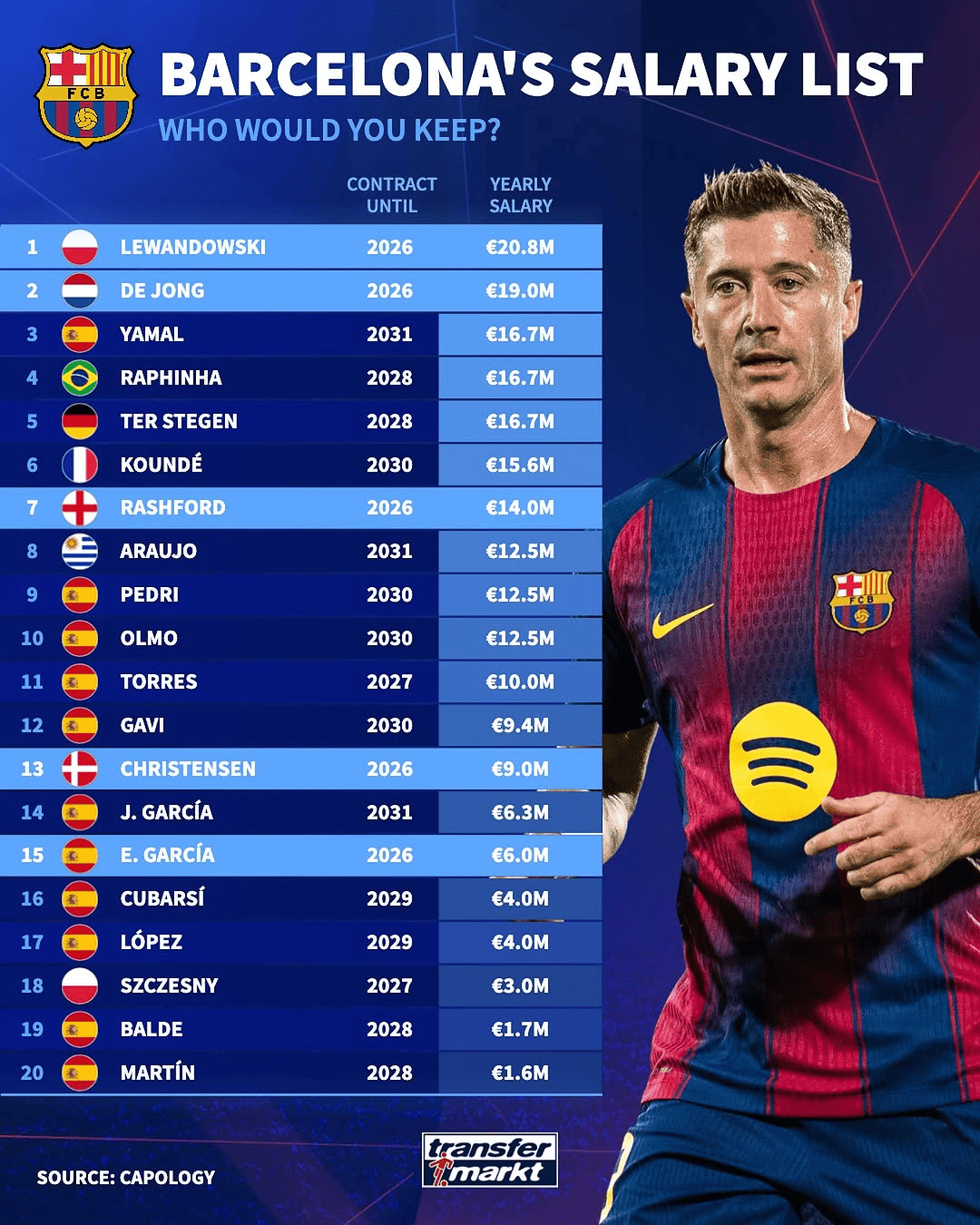 巴萨年薪榜:莱万2080万居首,德容亚马尔二三,10人超千万